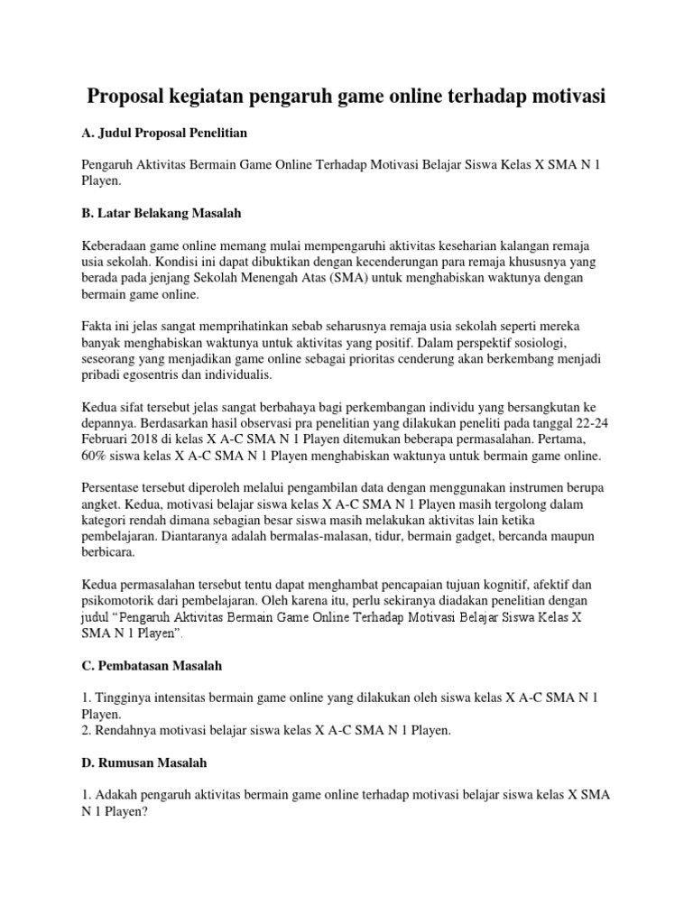 Judul proposal penelitian pengaruh aktivitas bermain game online terhadap motivasi belajar siswa kelas x sma n 1 playen. Game online merupakan sebuah gaya hidup baru bagi beberapa Adapun jumlah populasinya adalah 396 siswa sma negeri 1 taman.